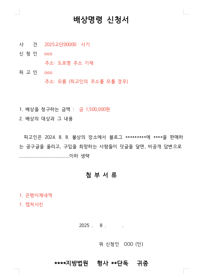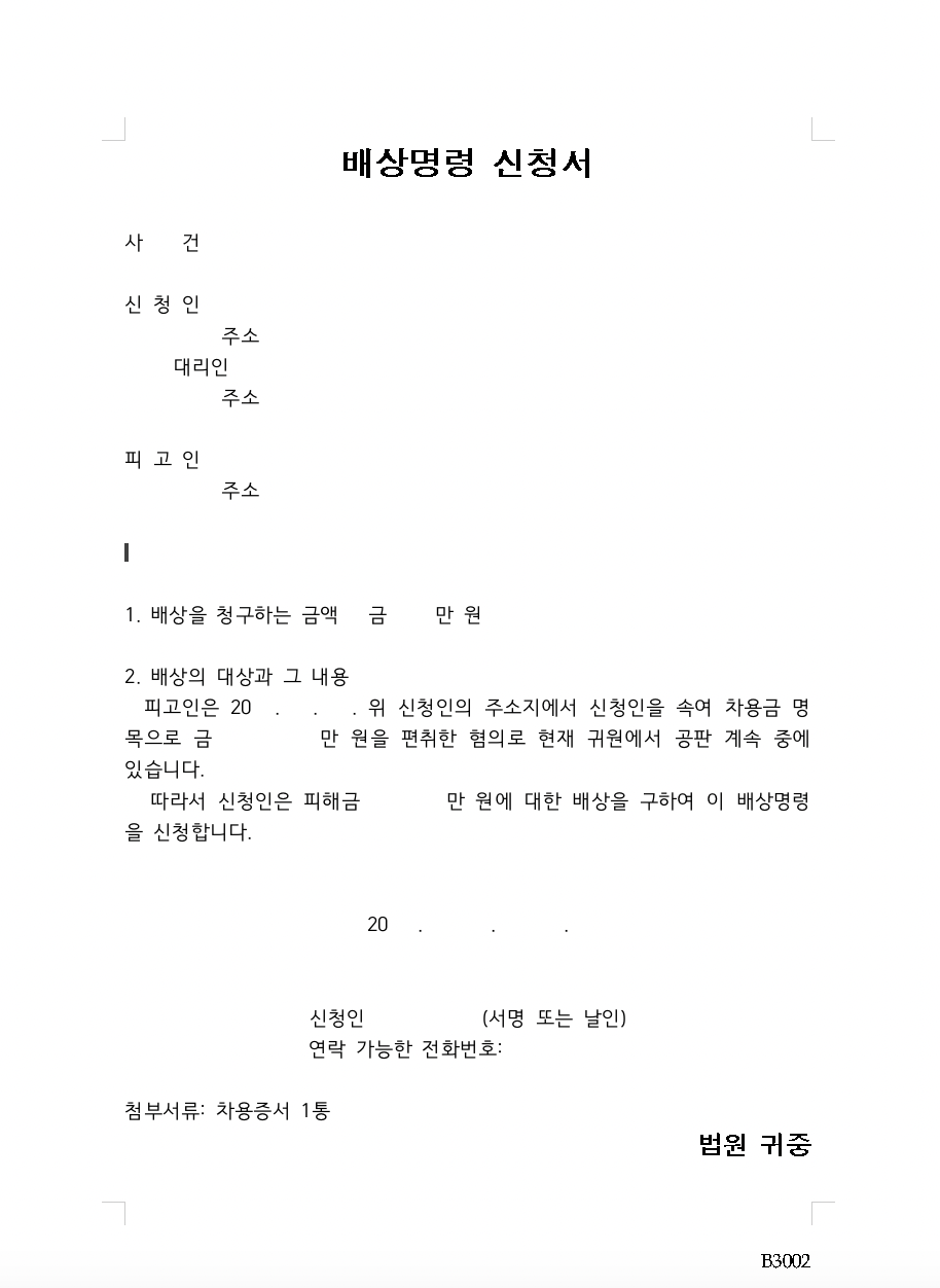 • 배상명령신청서는 법원용 1부와 피고인의 수 만큼의 부본을 제출하셔야 합니다.