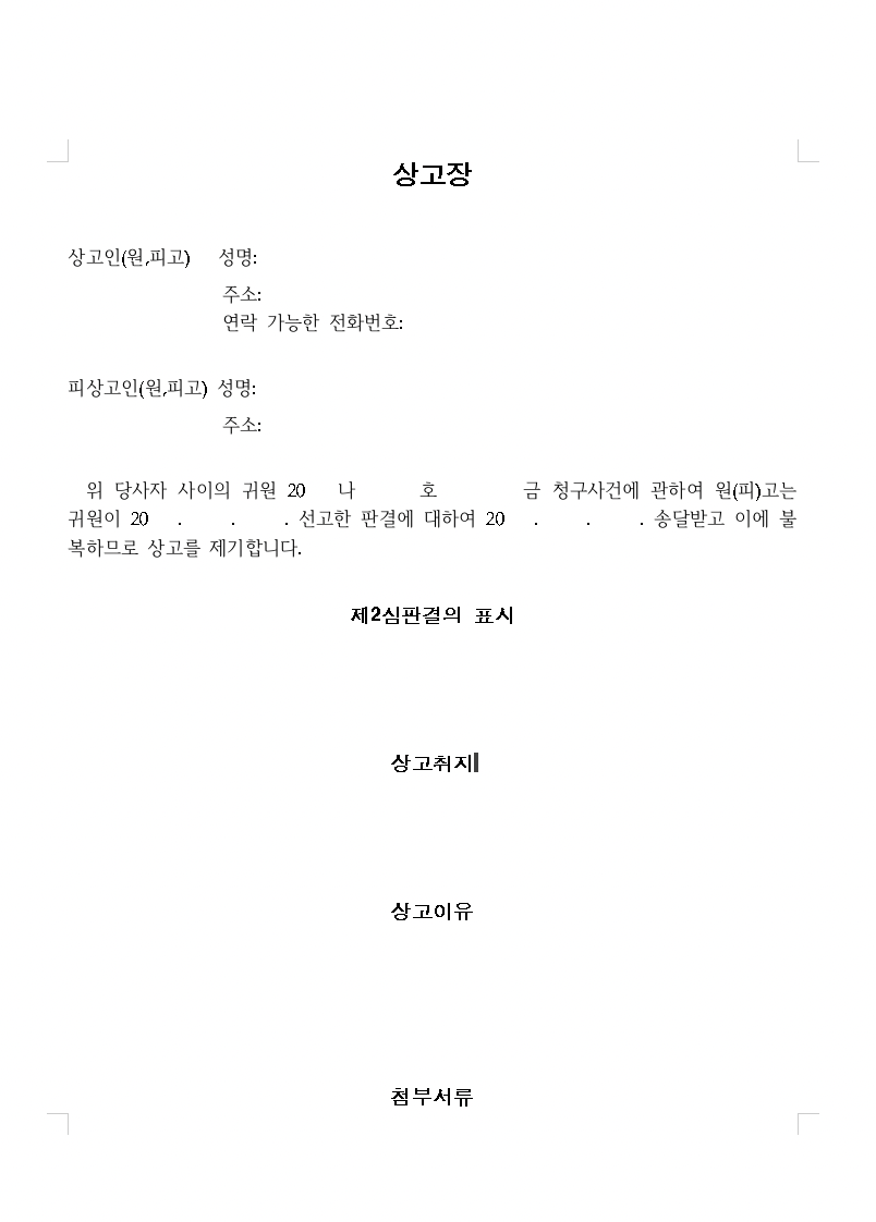 - 민사소송 : 항소심 판결문 송달받은 날로부터 2주 이내에 원심법원에 상고장 제출해야 합니다.