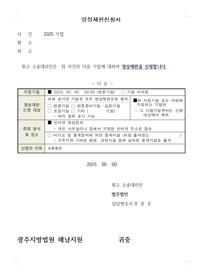 - 영상재판은 현장 출석과 동일한 법적 효력을 갖습니다.