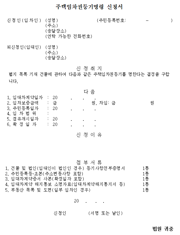 - 온라인 접수: 대법원 전자소송 사이트 → "임차권등기명령" 메뉴 이용.